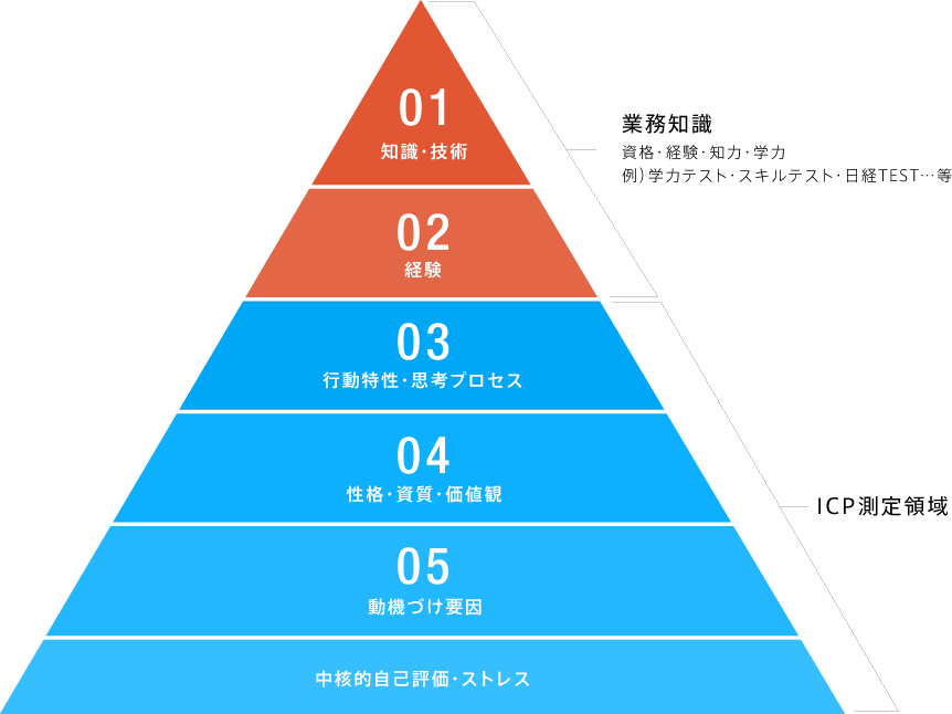 - ICP人材力診断が測定する03~05の領域は、身につけた01、02の知識やスキルを、どのように判断し、行動するか、といった思考プロセスやコンピテンシー、また、本来持っている資質や性格を指します。