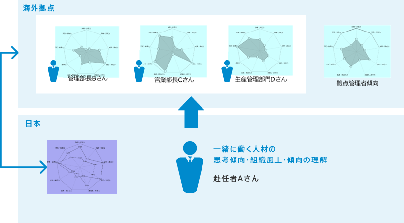 企業のグローバル展開に伴い、留学生の採用・育成、海外赴任や現地採用など、これまで以上に個人や組織の特性を把握する必要性が生じています。ICP人材力診断はビジネスパーソンの考え方や行動特性の違いを定量的に把握できるため、適切なマネジメントの手段を選択できる指標となります。